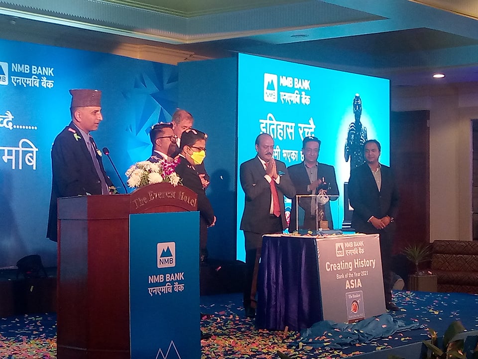 उपाधिकालागि बैंकलाई बधाई दिँदै सम्माननीयप्रधानमन्त्रीले “दि बैंक अफदिइयर एसिया २०२१” जस्तो विश्व–प्रतिष्ठित अवार्डद्वारा सम्मानितभएर एनएमबिबैंकले रचेको इतिहास यस बैंकले मात्रै नभई नेपालीवित्तीय क्षेत्रले नै ठूलो उपलब्धिमान्नुपर्ने बताउनुभयो ।\