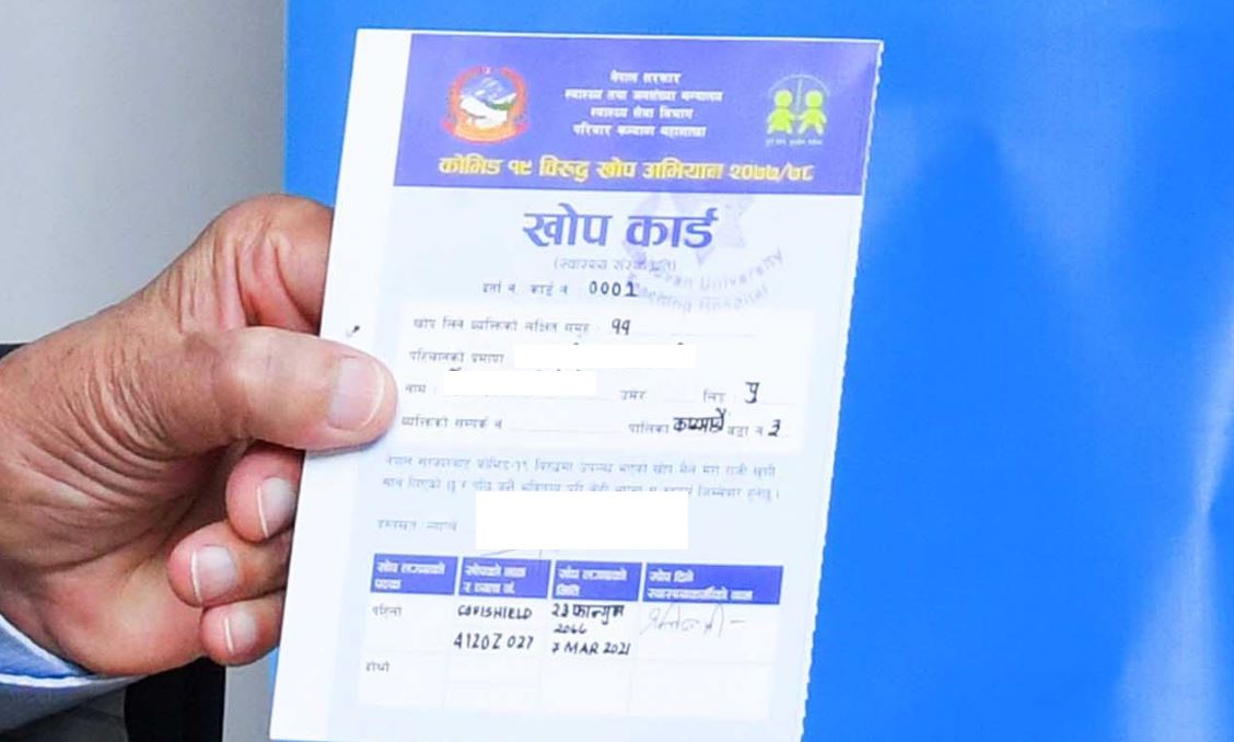 कोभिड १९ सङ्कट व्यवस्थापन समन्वय केन्द्र सिसिएमसिसीले सरकारी कार्यालयसहित होटल, रेस्टुराँ, हल, रङ्गशाला, पार्कलगायतमा प्रवेश, विदेश जान खोप कार्ड अनिवार्य गरिनुका साथै खोपको बुस्टर डोज लिनका लागि पनि खोप कार्ड आवश्यक हुन्छ ।कतिपय मानिसले खोप लगाएपनि कार्ड नभएको , वा खोप कार्ड हराएको भन्दै चिन्ता व्यक्त गरेका छन् ।