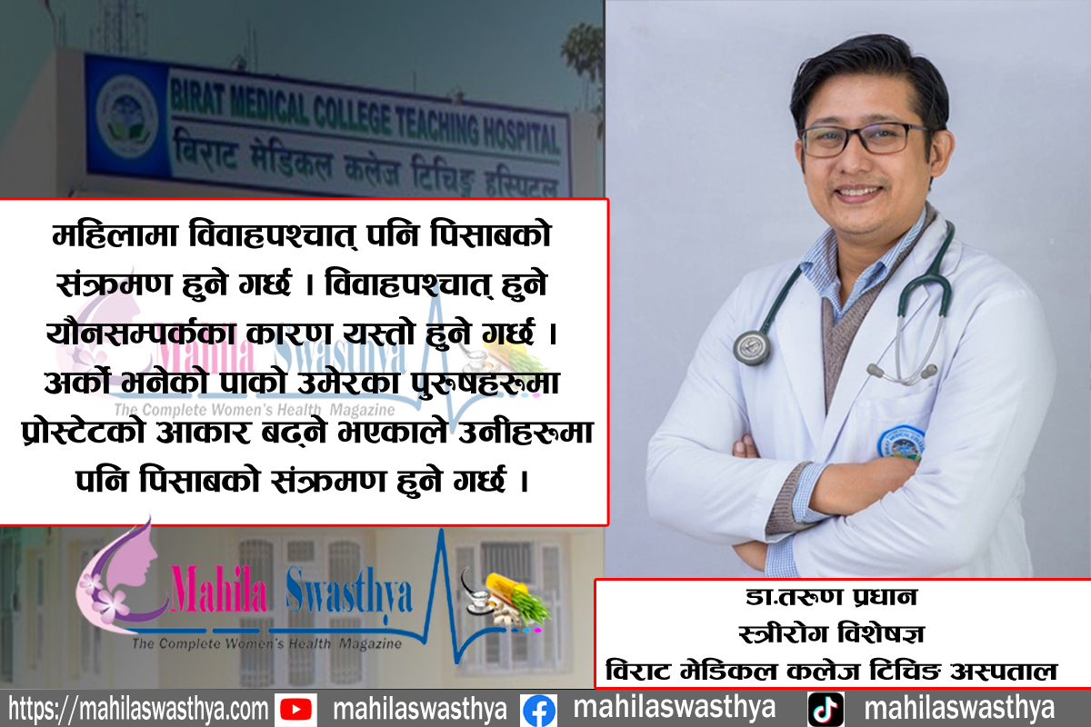 महिलामा विवाहपश्चात् पनि पिसाबको संक्रमण हुने गर्छ । विवाहपश्चात् हुने यौनसम्पर्कका कारण यस्तो हुने गर्छ । अर्को भनेको पाको उमेरका पुरुषहरूमा प्रोस्टेटको आकार बढ्ने भएकाले उनीहरूमा पनि पिसाबको संक्रमण हुने गर्छ । वेलैमा पिसाबमा हुने संक्रमणबारे युरोलोजिस्टको सल्लाहअनुसार उपचार नगरेमा यसले मानिसको ज्यानसमेत लिन सक्छ।